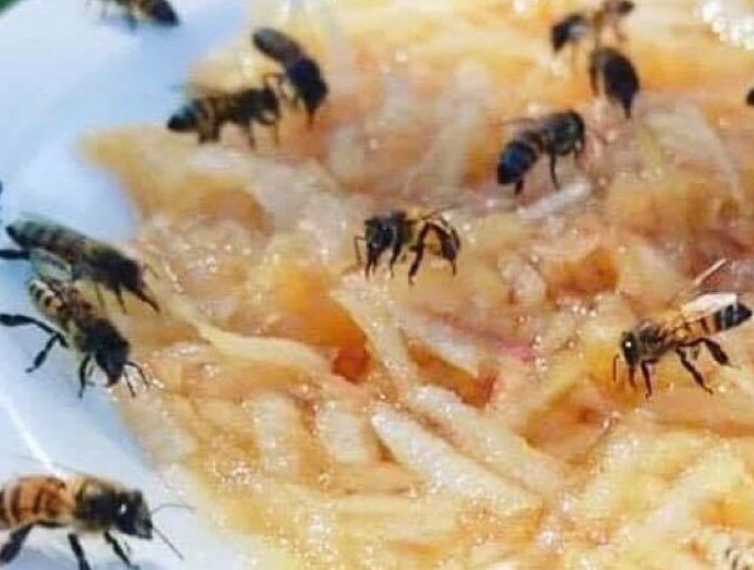 First up … to repeat a basic point: honeybees eat honey (which they make from nectar, the sugary juice of flowers which they collect by forage-feeding). They do not eat fruit (the end result of flowers being pollinated by foraging insects – including, erm, bees). Additionally, honeybees have a natural aversion to alcohol … And guess what happens when you mix grated apple with water and leave it lying around … yup, that’s right, it ferments … as in, it turns to alcohol. Meaning, your plate of grated apple in water will not work as food for bees. It will however attract wasps. Lots. Of. Wasps. (footnote: in unusual circumstances – for example, if they are starving and there are no flowers around, then yes, bees will chow down on whatever sugar source is available – including the junk-food options).
