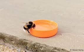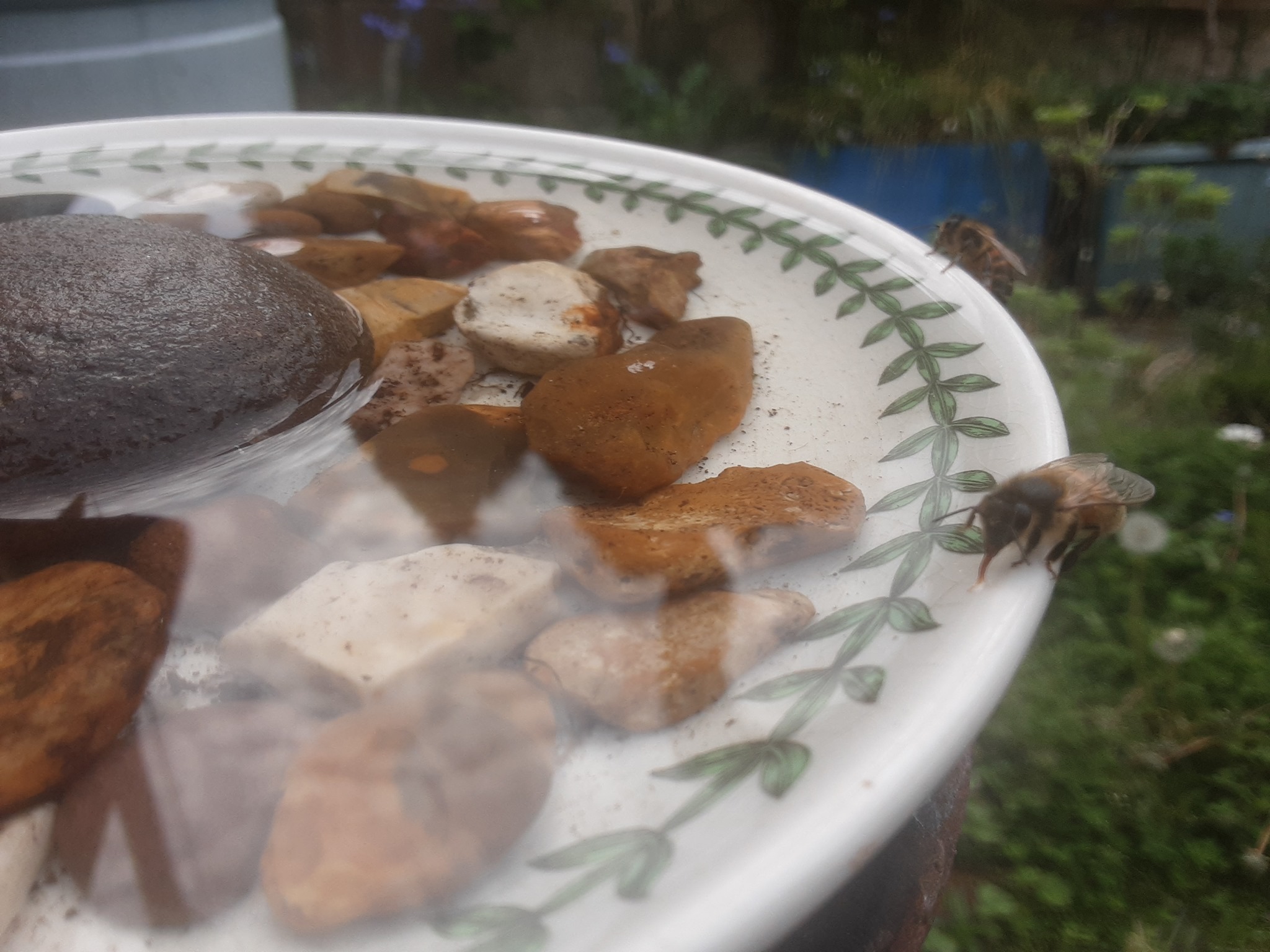 Firstly, yes, go ahead and create your ‘bee bar’. A shallow container, with a few pebbles, marbles or decorative stones (for the bees to stand on, so they do not drown). But please, no sugar water. No honey. And certainly no grated apple. Instead fill it simply with clean, fresh water. Honeybees take water back to the hive, to dilute their stored honey, ready for use. Other insects too will come for a drink. Add fresh water daily, and occasionally wash the container and also the stones (a quick rinse and scrub in clean water, to prevent algae and other build-up).