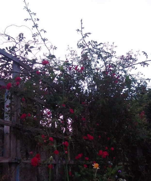 Poetry is an art that I myself am yet to master. Yet. If ever. One day (perhaps) I may try. Perhaps. In the meantime, this first session was inspirational, and energising … yet it left me depleted. I’d not known what to expect, found it difficult to stay focussed, and then when it was over I felt fidgety and strangely emotional … Simultaneously flat, weirdly tearful, yet oddly also rested and lifted. Only one thing for it: a hot, deep, bubbly bath. With tea. And chocolate. Waiting for the kettle to boil (for said tea) my gaze followed through the kitchen window to this climbing rose (pictured, below) currently sprawling, in full bloom, up and over the back fence. Framed against a dramatic sky (not yet dark with night, but heavy with impending weather) it somehow matched my mood. The picture does it no justice: poor lighting and insufficient techno-whizzary to make full use of the camera settings. I’ll take another tomorrow. In better light.