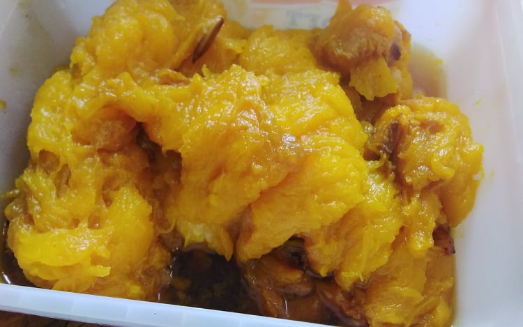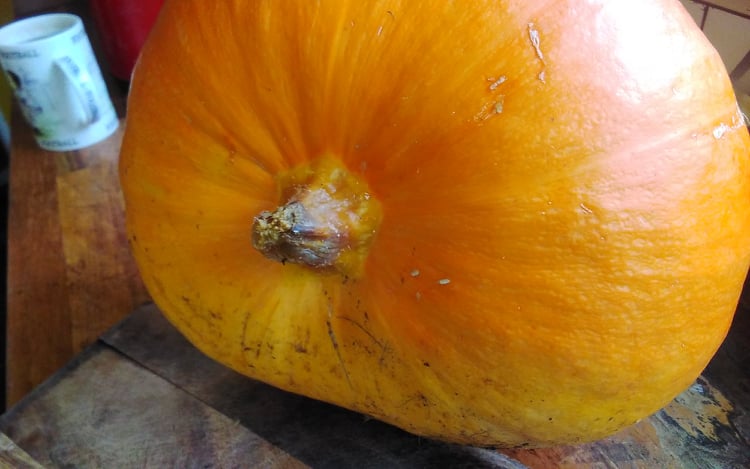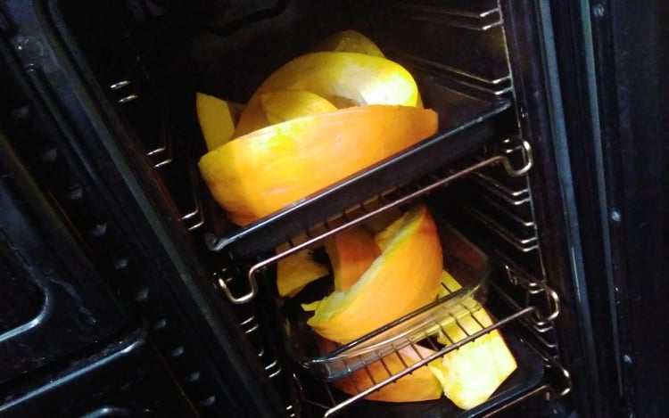 Sadly, ‘Giant Ginge’ didn’t quite make it to record-breaking proportions. So, no prize win for my man (this time). And, once picked and left to cure, the stalk very obviously started to rot. Meaning, this beasty had to be used sooner rather than later. So, it was, into the oven in large chunks (skin on, seeds removed) to be roasted to reduce moisture content and improve flavour (these giant pumpkins are bred for size, not taste, they are full of water and not the greatest for cooking and eating).