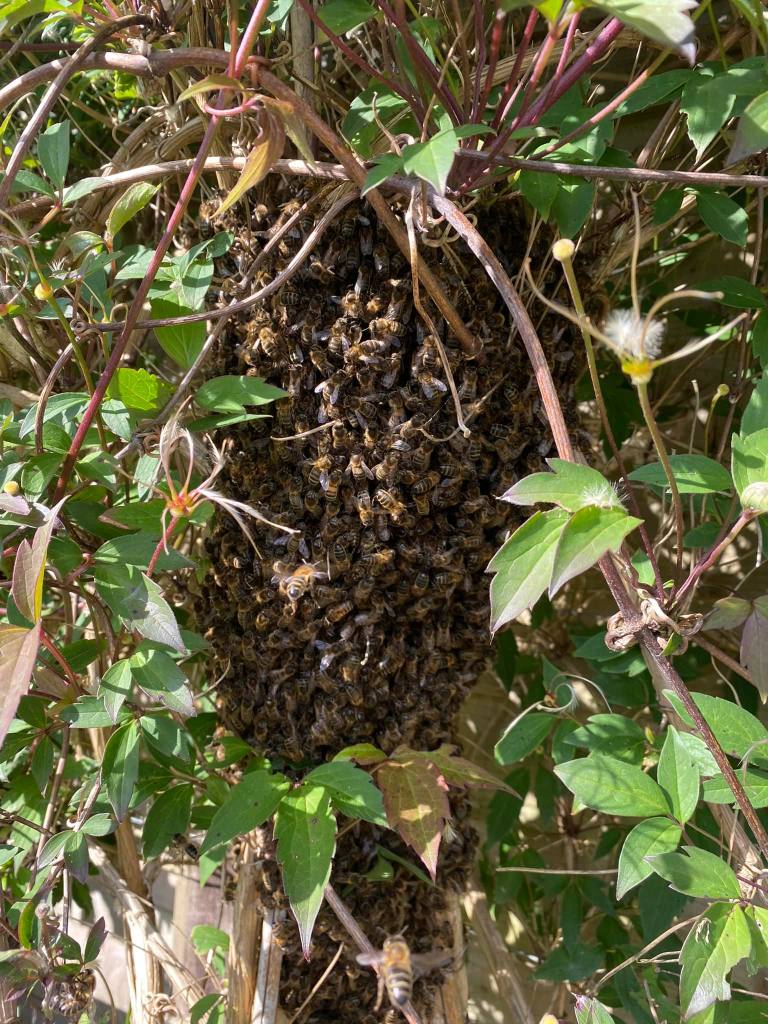 Just three days ago, I documented the arrival of not one but two colonies of honeybees, reinstating me as an actual beekeeper since Storm Eunice toppled by last remaining overwintered hive back in February. Here I likened honeybees to busses – wait long enough for one and two then arrive together. Well, it turns out I was wrong. Three is the magic number. Why? Because, within hours of writing that blogpost, up popped a call via a Facebook community group: ‘Help! A swarm has landed in my garden!’ Lucky for me, I was the first to respond, and they are now happily settled in a polynuc, awaiting relocation to a full-size hive as permanent home. Retrieving a swarm is such a magical experience – I’m yet to meet a beekeeper who has tired of watching a colony ‘march’ willingly into a box (the trick is to get the queen in first – once she is safely in there, the rest will follow).